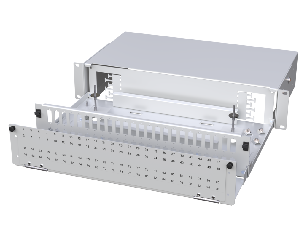 Fiberoptisk patchpanel Ultra High Density (UHD). Patchpanelen är gjord av robust alu-zinkmetall med en hållbar pulverlackerad finish i ljusgrå färg.