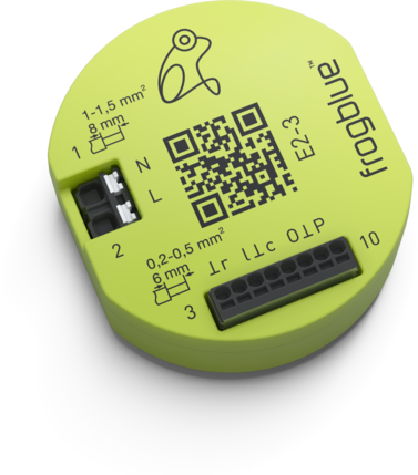 är hjärtat i varje frogblue-system och monteras i elcentral, infällda dosor eller direkt bakom strömbrytarna med 230V. Våra frogs bildar ett meshnätverk där allt från att dimra, styra belysning, värmereglering, regera på väder, sensorer för larm. Till att öppna dörrar, kort sagt dessa små frogs sammanfogar din fastighet från golv till tak. De är grunden i det trådlösa frogblue Bluetooth® nätverket och har ”virtuella ledningar” till andra frogs. Dessutom vidarebefordrar de meddelanden och ökar på så sätt räckvidden. Dataöverföringen mellan frogsen sker uteslutande krypterat (128 bitar) och detta utöver Bluetooth® krypteringen. VDE-godkännandet garanterar att krav på brandskydd och elektrisk säkerhet uppfylls. Frogsen är mycket energieffektiva (0,2 W) och loggar energiförbrukningen och all meddelandehistorik i flera månader.