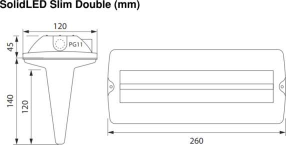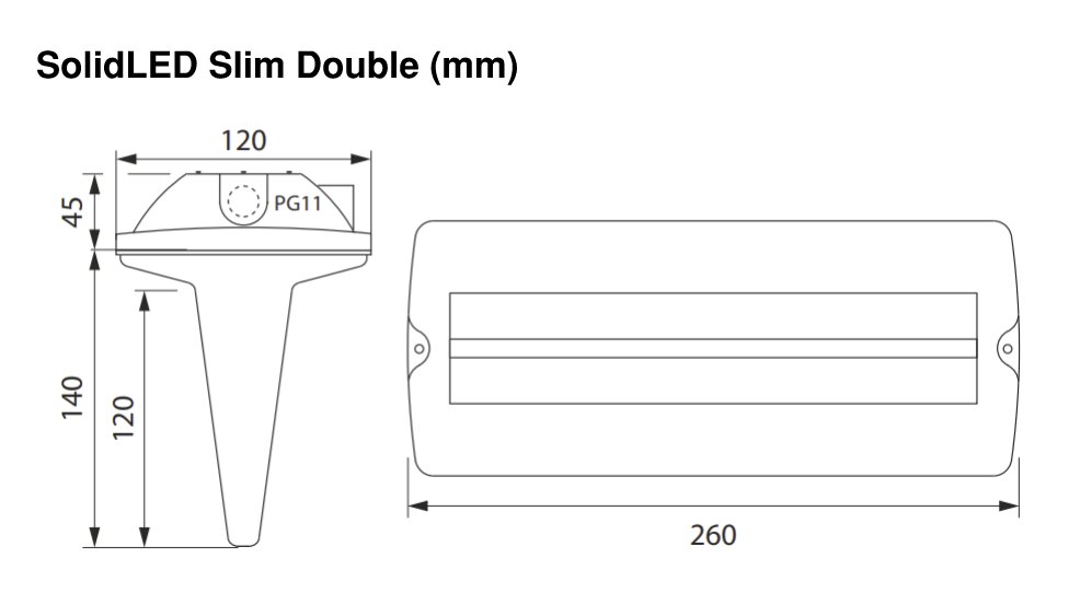 SolidLed Slim kommer med 4st piktogram för alla riktningar och ett läsavstånd på 23m. Armaturen är utrustad med ett miljövänligt LiFoPo4-batteri som ger möjligheten att välja på 1h eller 3h backup tid. Självtestet utför ett test var 15e dag och gör då ett funktionstest, och ett fullskaligt test i 60min en gång per år.