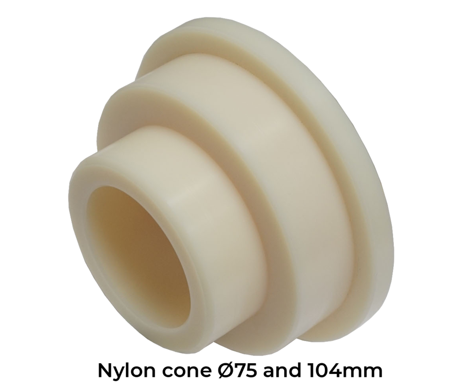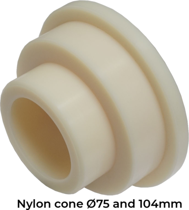 Levereras med nylonkoner för håldiametrar: Ø75 och Ø105mm, samt låsringar.