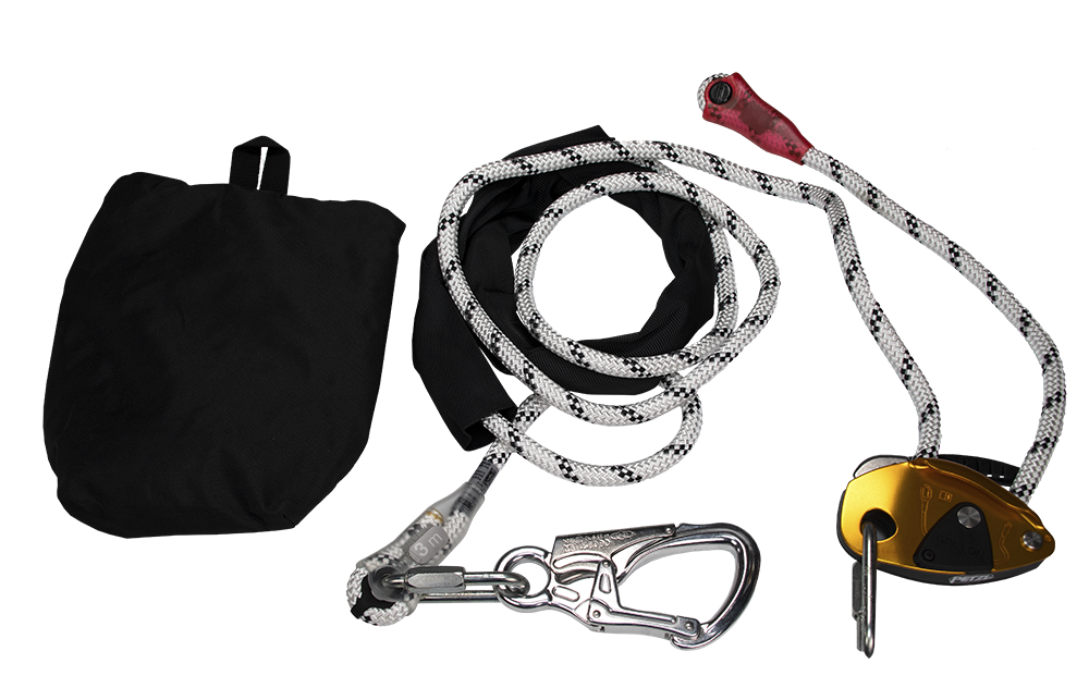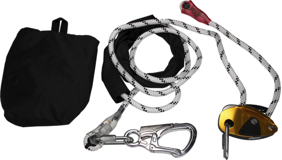 Här hittar du stödlinorna "Petzl Grillon", fallskyddslinjer och avlastningslinjer för att rädda en nödställd person på en mast.