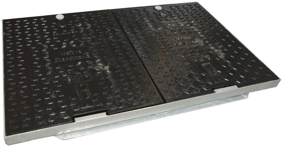 Gjutjärnslock B125 till kabelbrunnen PV2436, 2-delat med brunnsluckor tillverkade i gjutjärn. Låsbart med pentahead bult integrerad flytram 70mm.