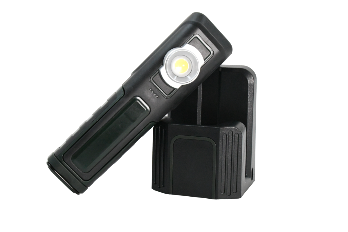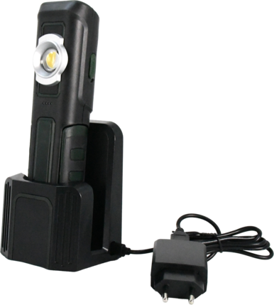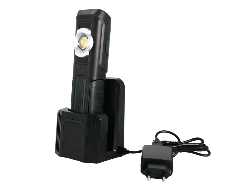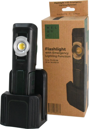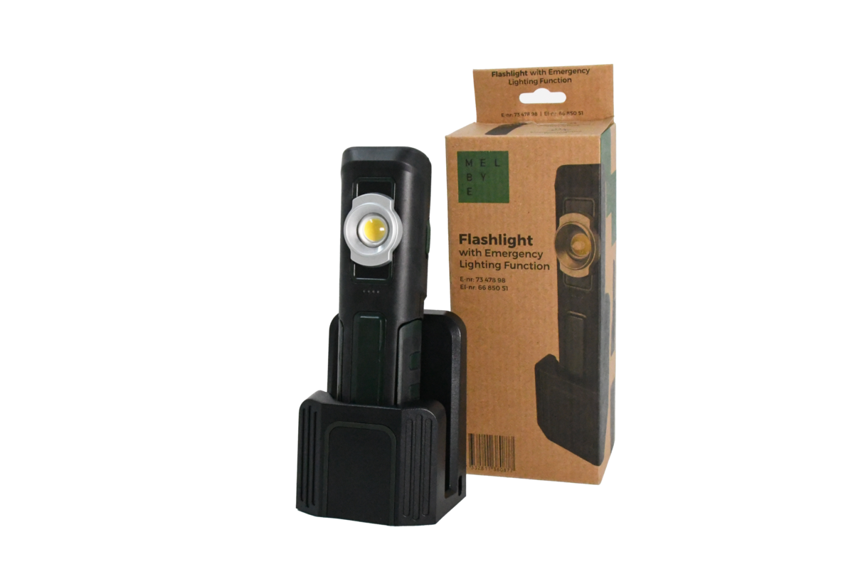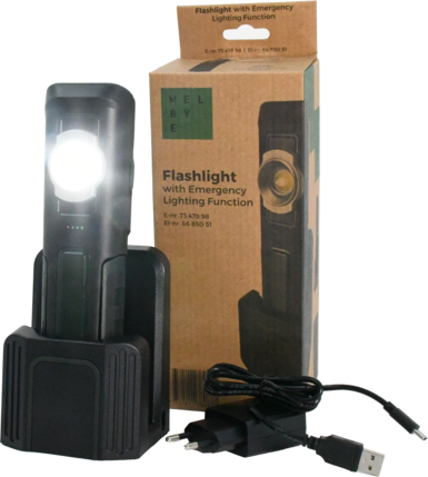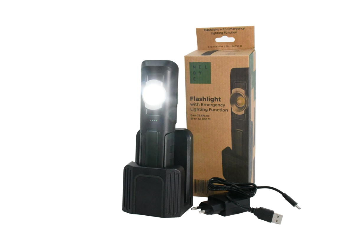 Handlampa med nödljusfunktion. Levereras med bordsställ och laddare.